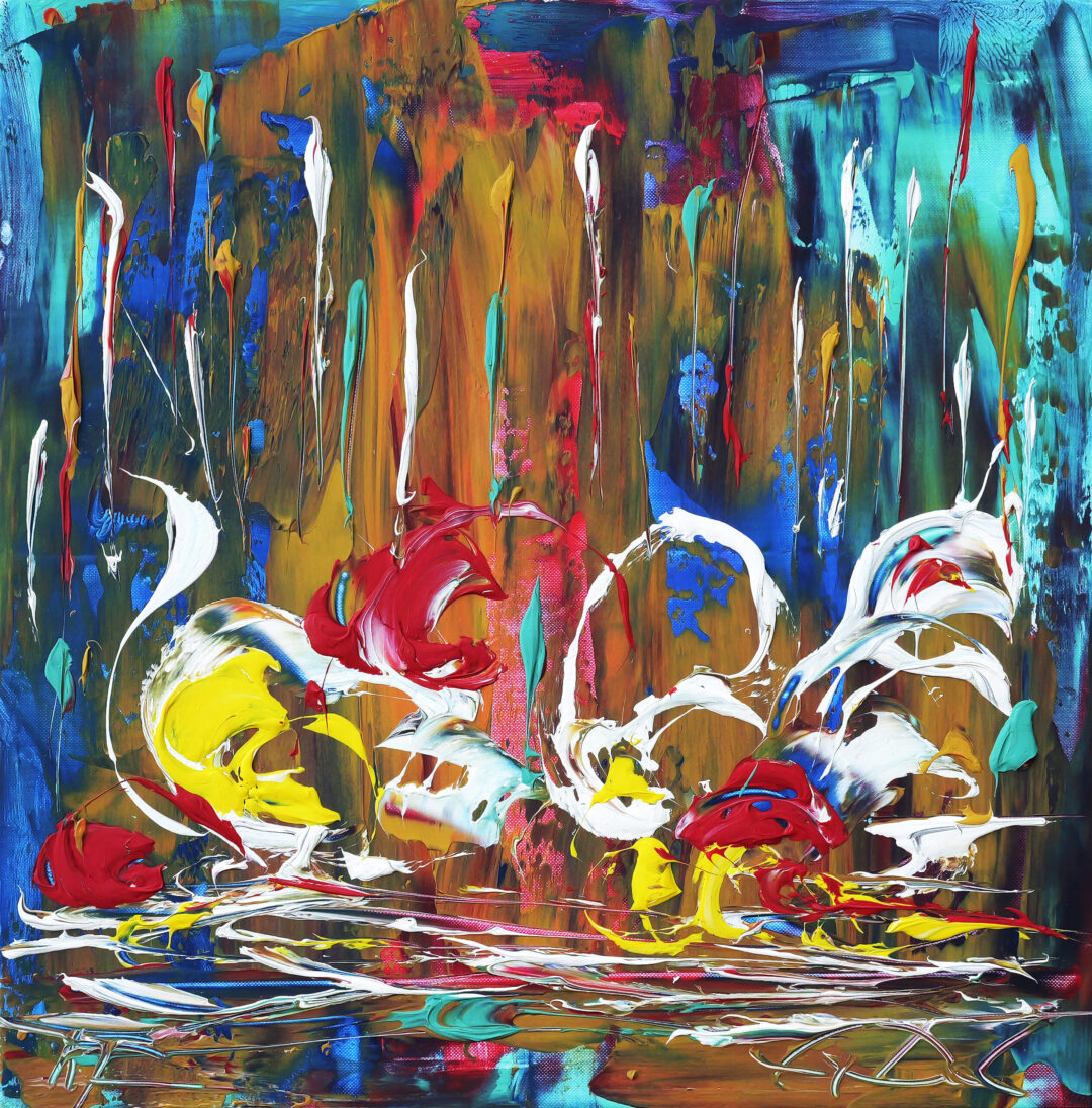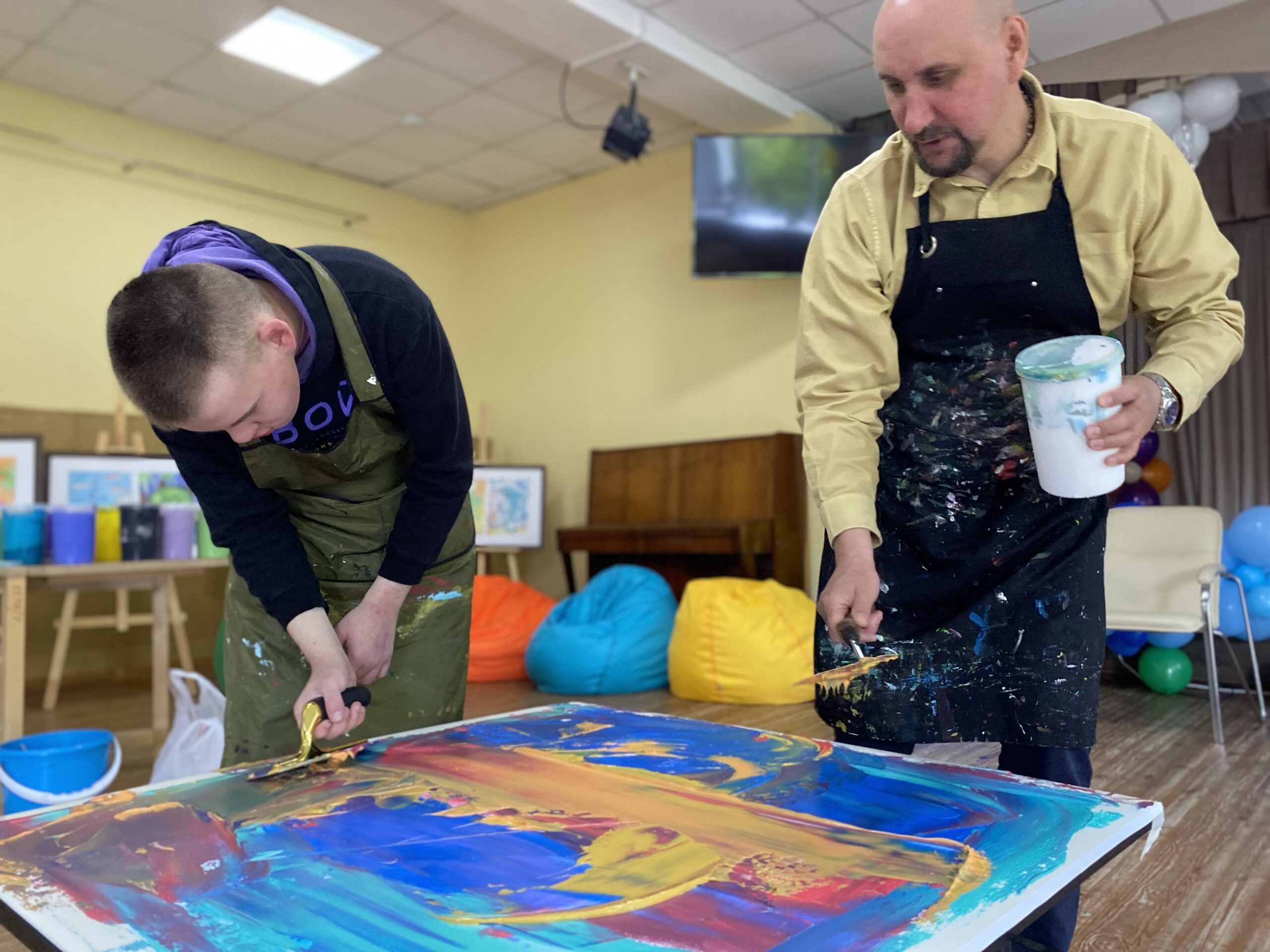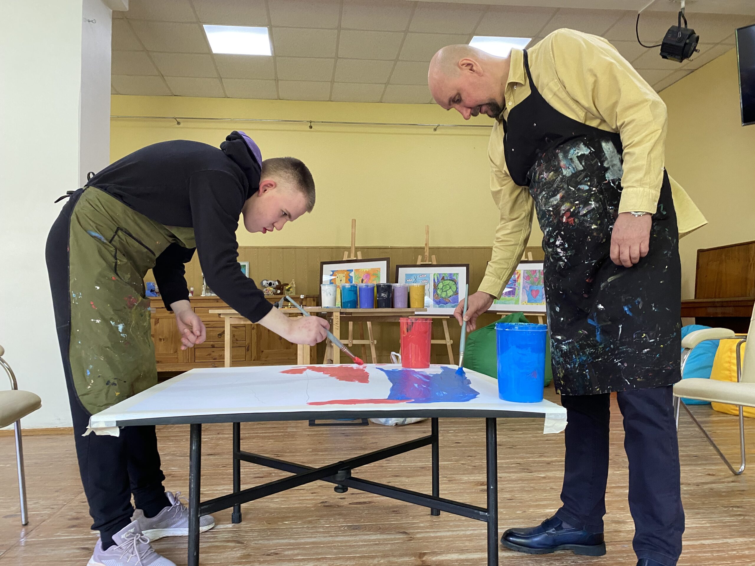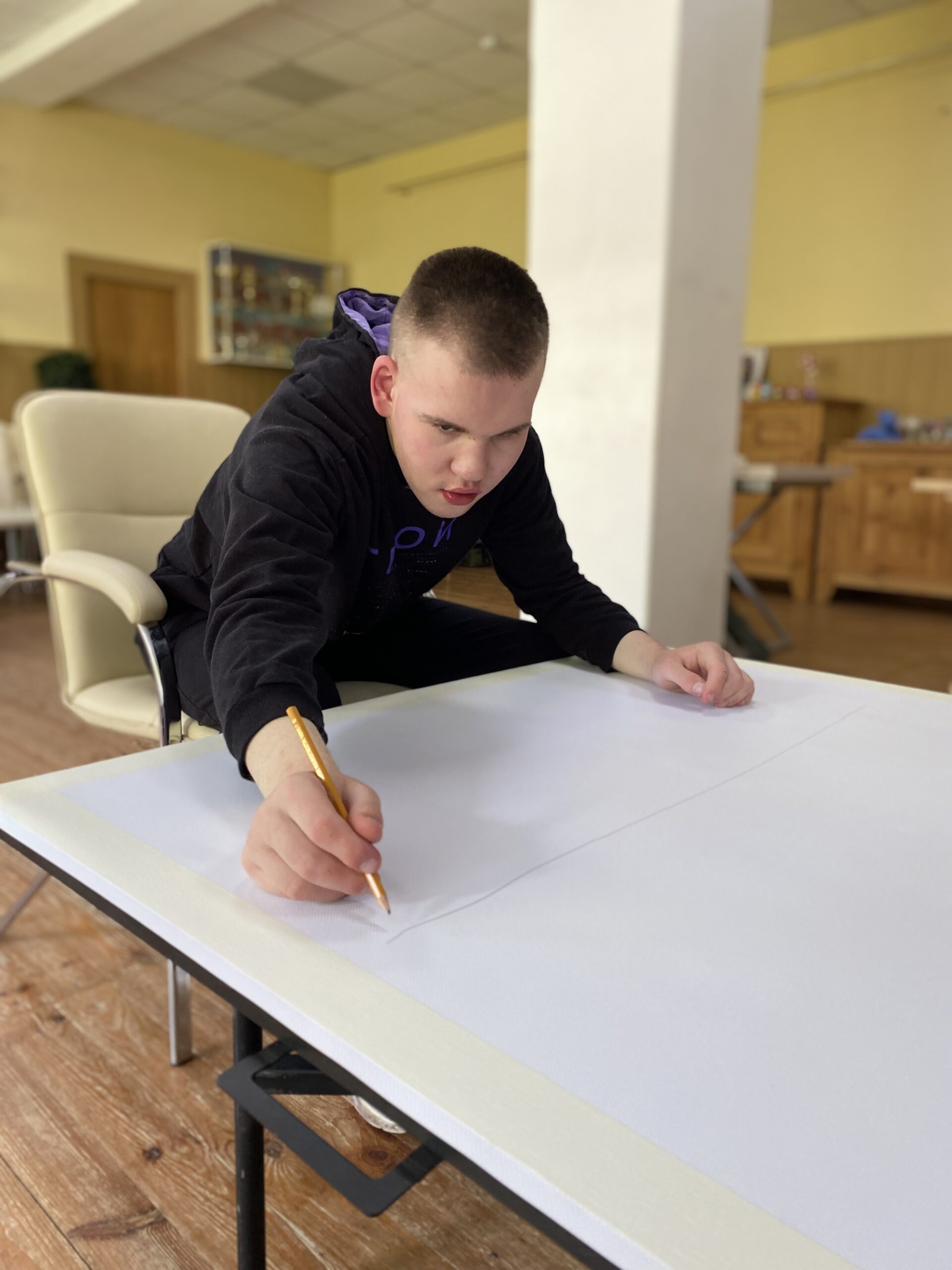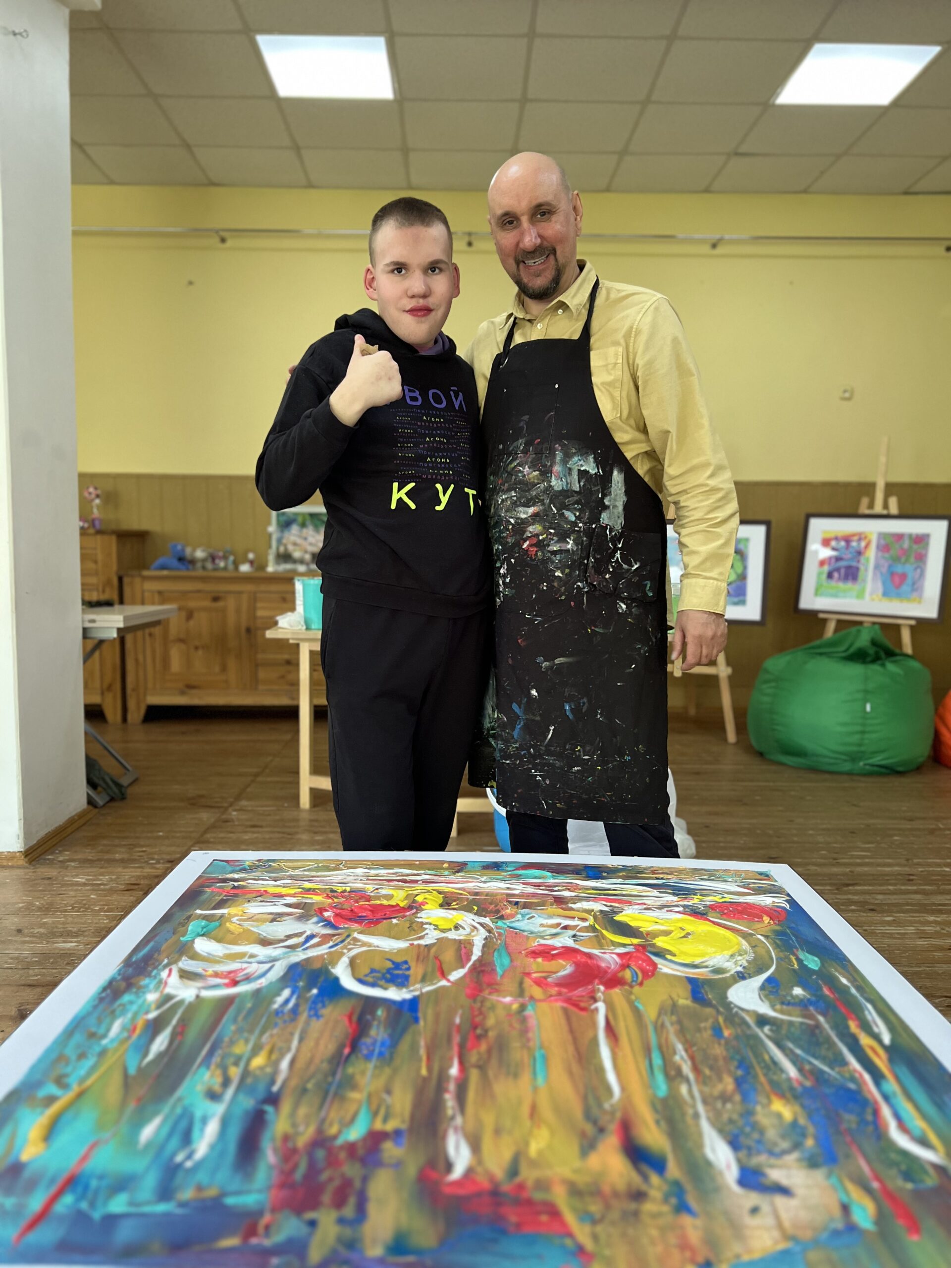 На арт-встрече с Сергеем Дасом он, не раздумывая, нарисовал любимого героя. Сначала — простой прямоугольник, и вдруг ожил силуэт добродушного Крокодила Гены. Рядом появился голубой вагончик, наполненный теплом и детской радостью. Гена получился красным, но разве это важно? В этом — особая символика: цвет сердца, цвет боли и любви, смешанных в душе Алексея.