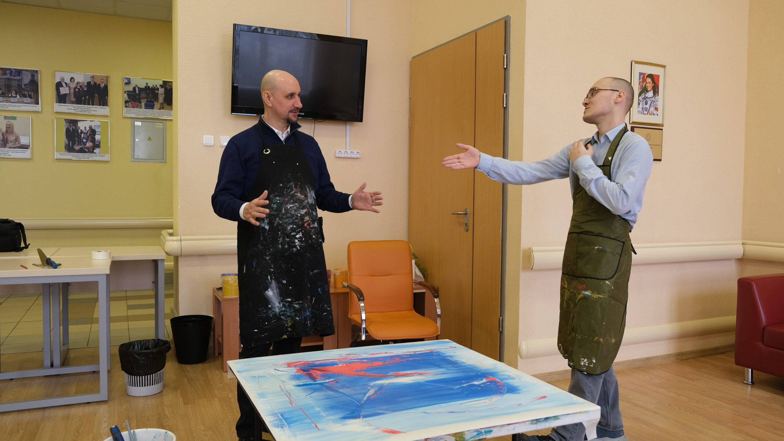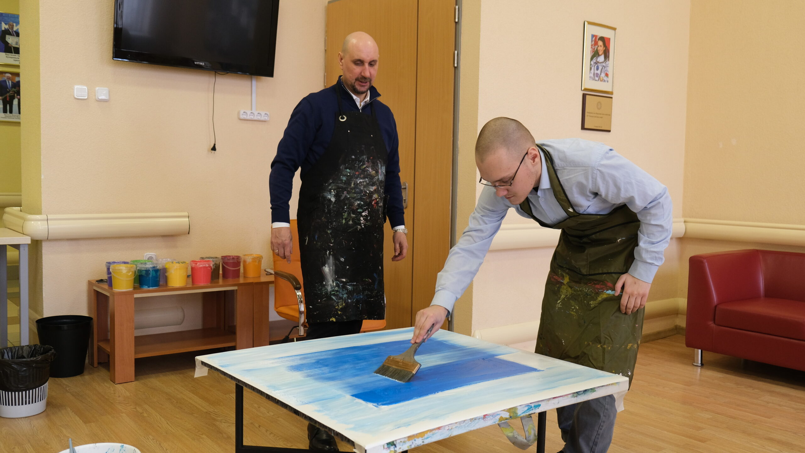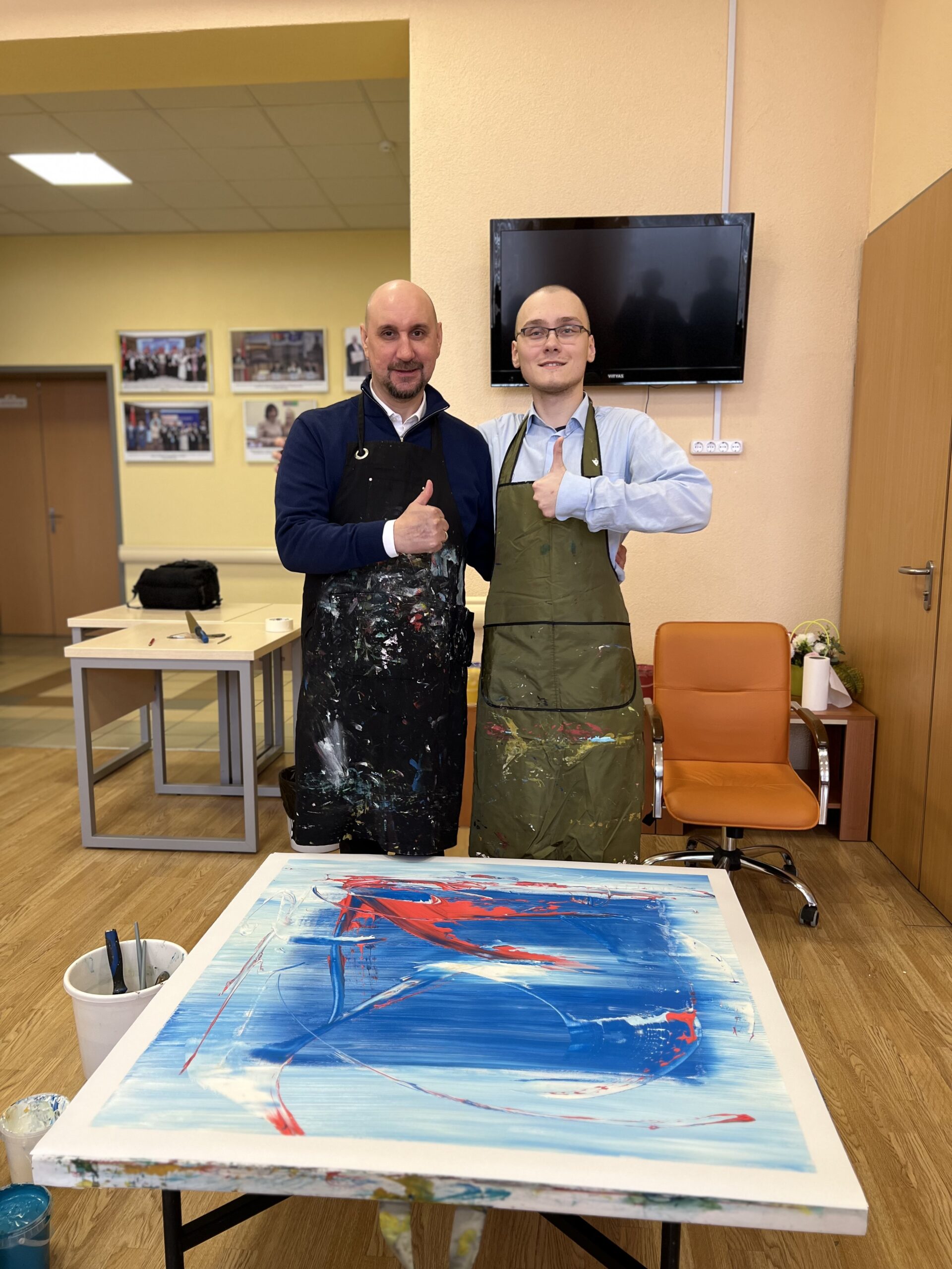 Однажды, во время арт-встречи художник Сергей Дас назвал его «суперменом», а он удивлённо посмотрел на художника и задал вопрос: «Как Вы догадались? Я ведь, действительно, могу всё, вот и картину сейчас мы с Вами напишем замечательную!». Когда Мишу спросили, с какой геометрической фигурой он себя ассоциирует, он без колебаний ответил: «Большой синий квадрат». Для него это символ прочности, устойчивости, нерушимости, и с этим у Михаила ассоциируется видение мира. А вдохновленный энергией Михаила художник добавил в картину смелый мазок красного – вспышку внутреннего огня, который сверкает в душе Михаила, освещая этот мир ярче любого солнца.
