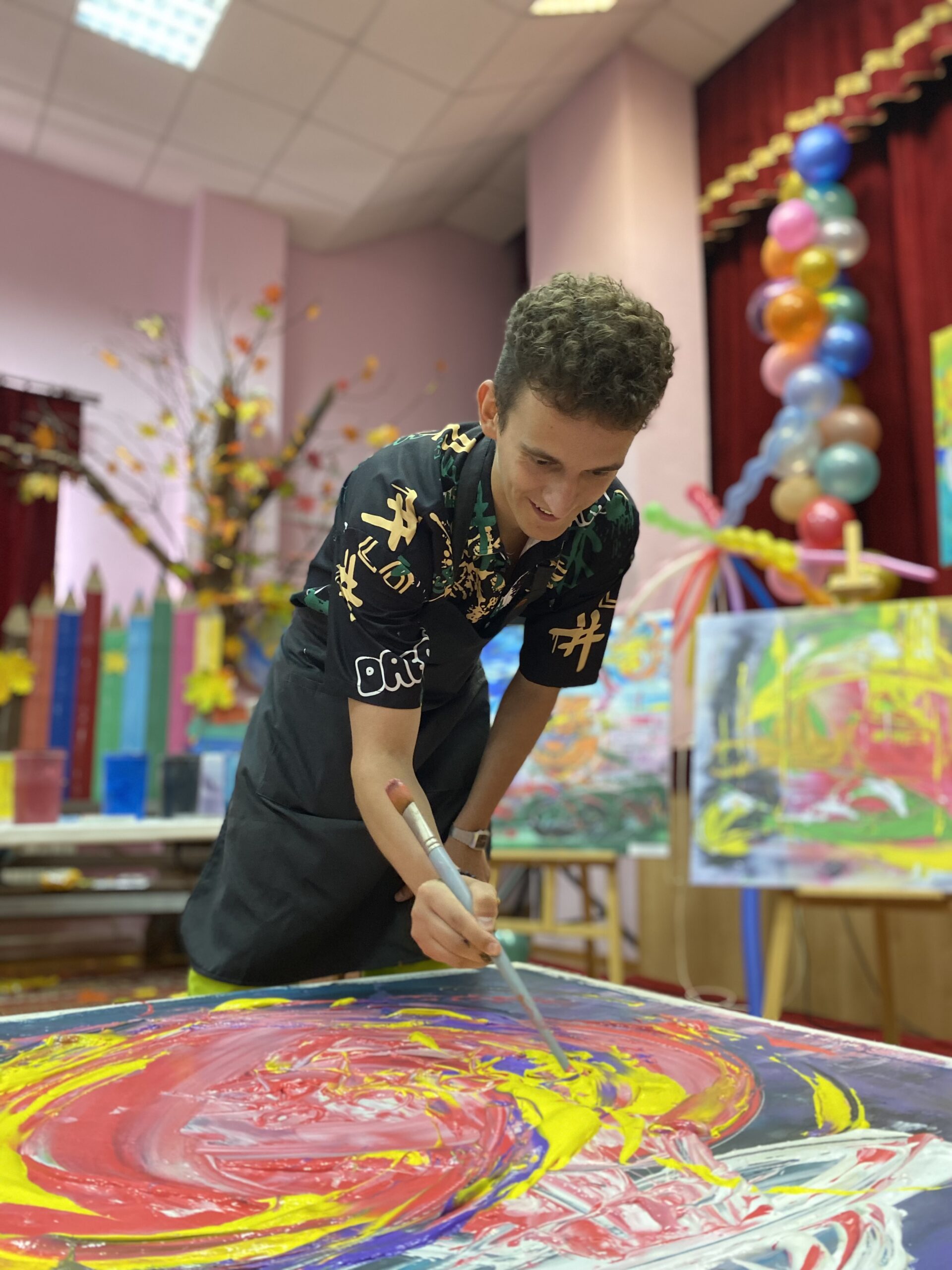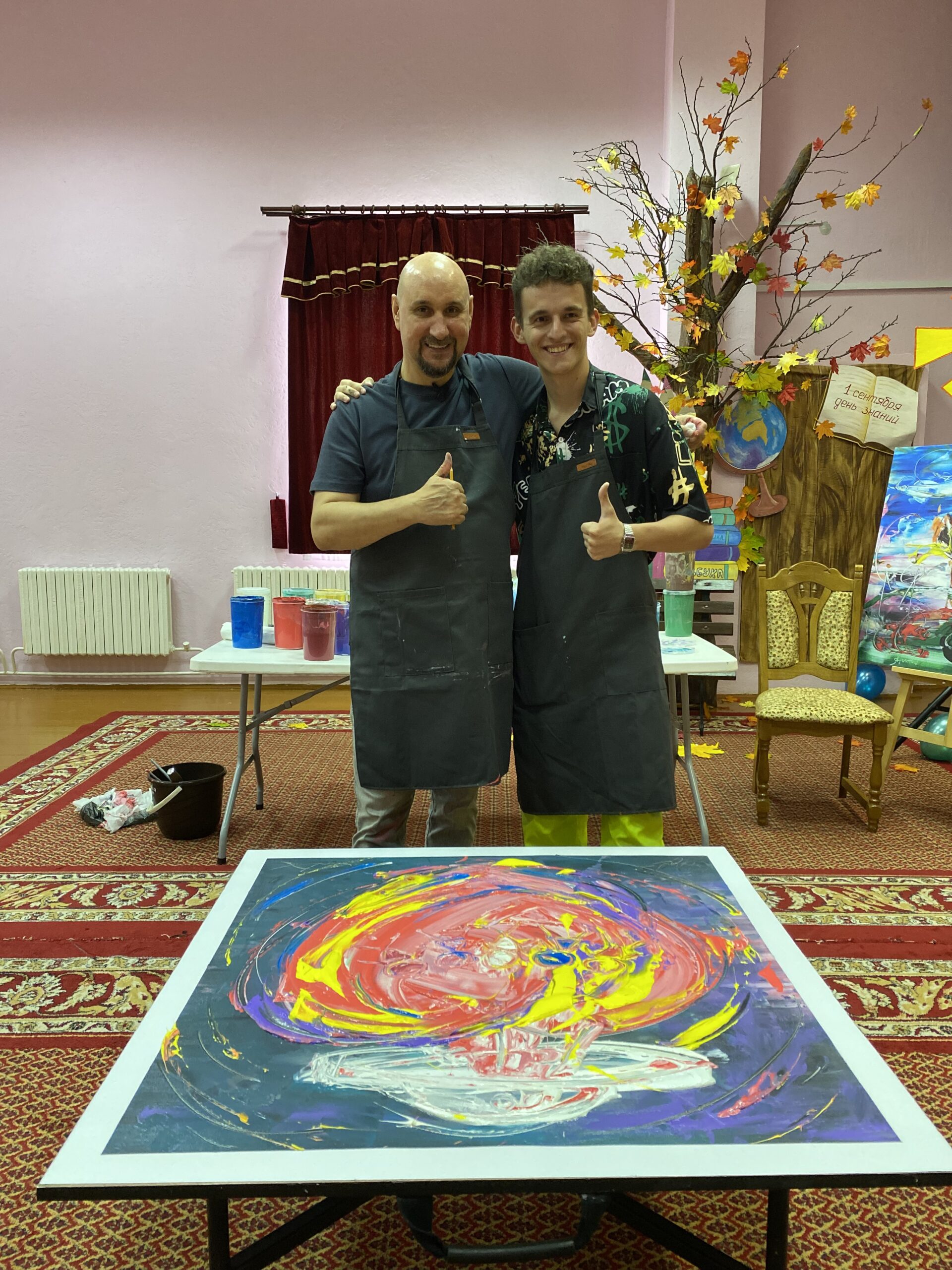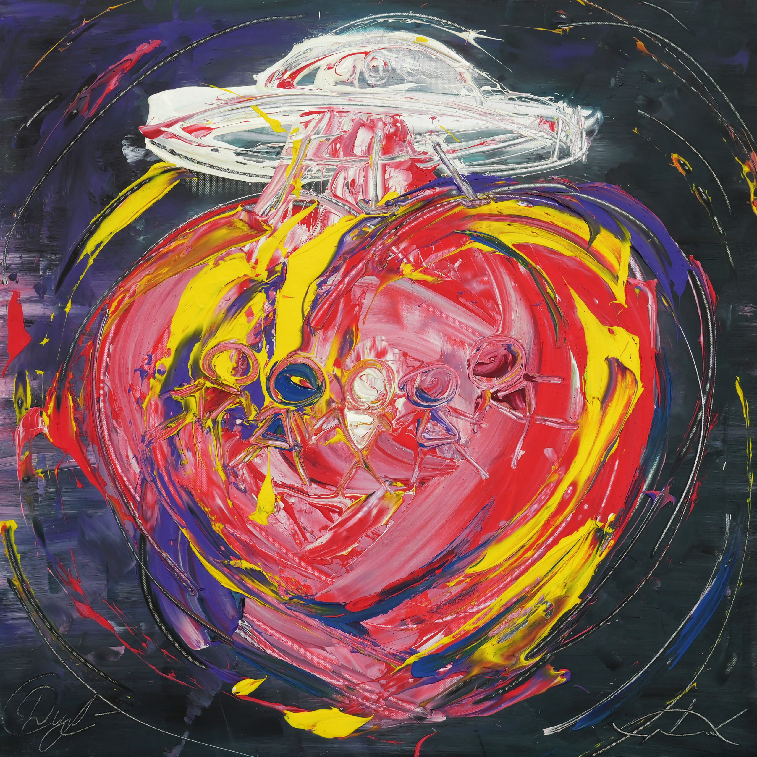 Вместе с художником Сергеем Дасом Дима создал картину, наполненную символами и светом. В центре холста — пылающее сердце: не то островок, не то целая планета, затерянная в необъятной Вселенной. Вокруг — глубокий космос, мерцающий безмолвием. А над сердцем парит летающая тарелка — словно маяк надежды, зовущий к теплу и взаимопониманию.