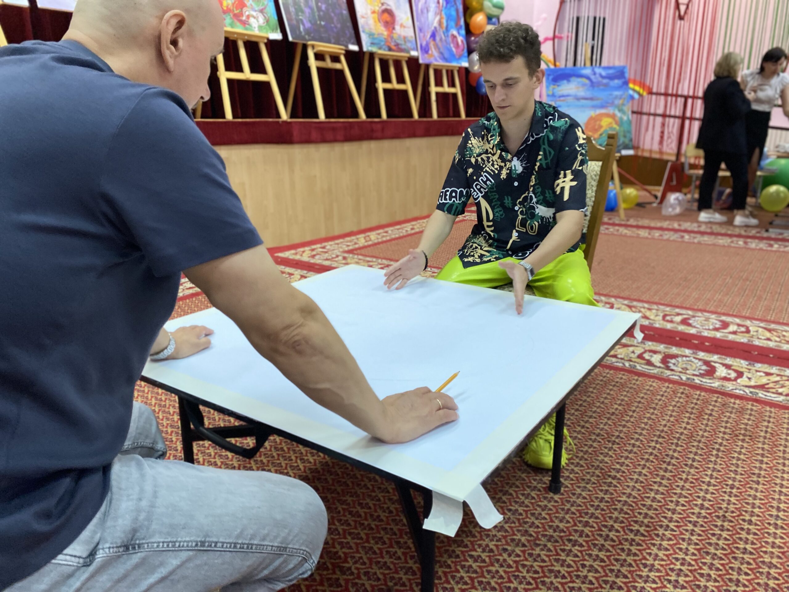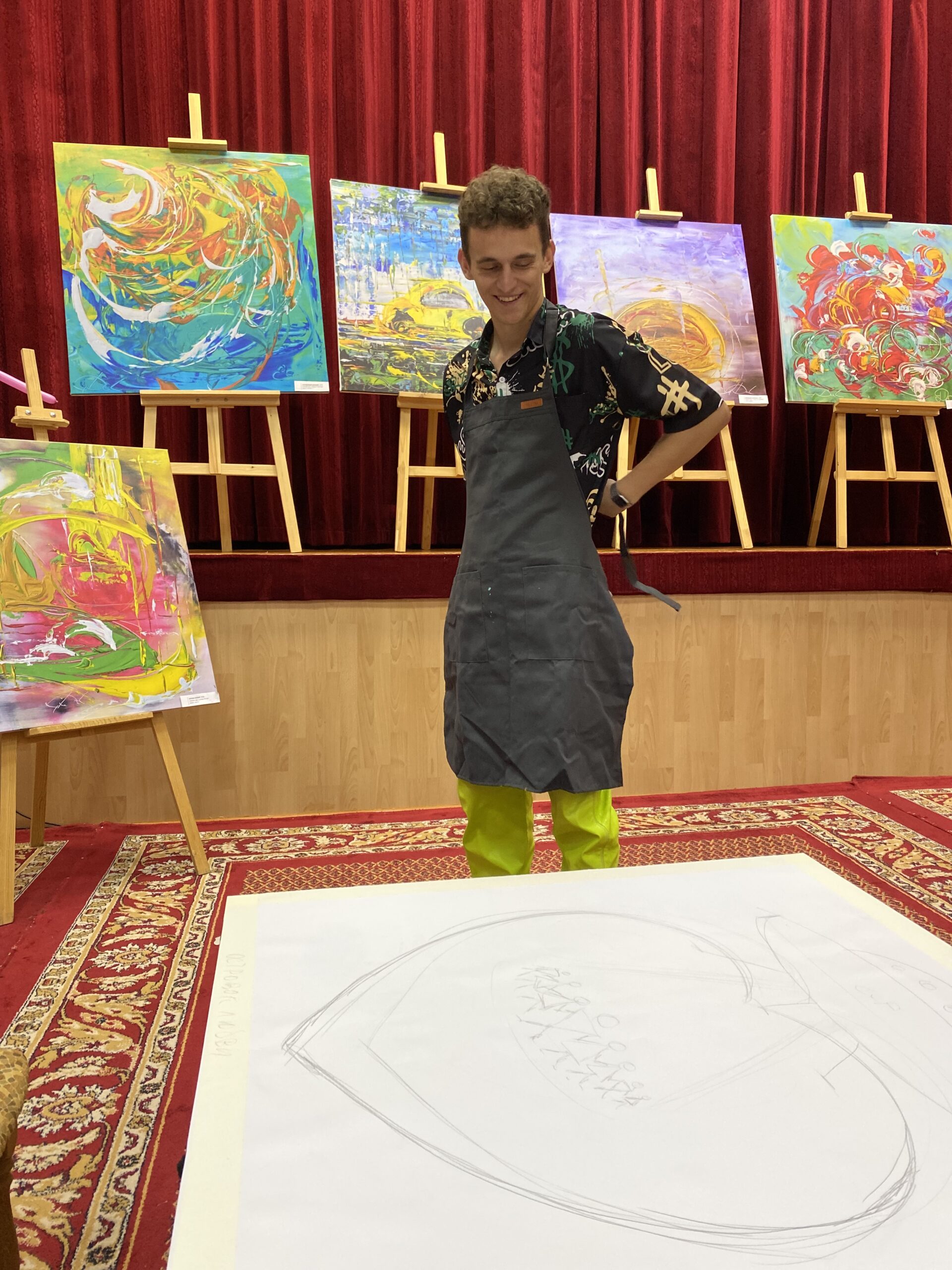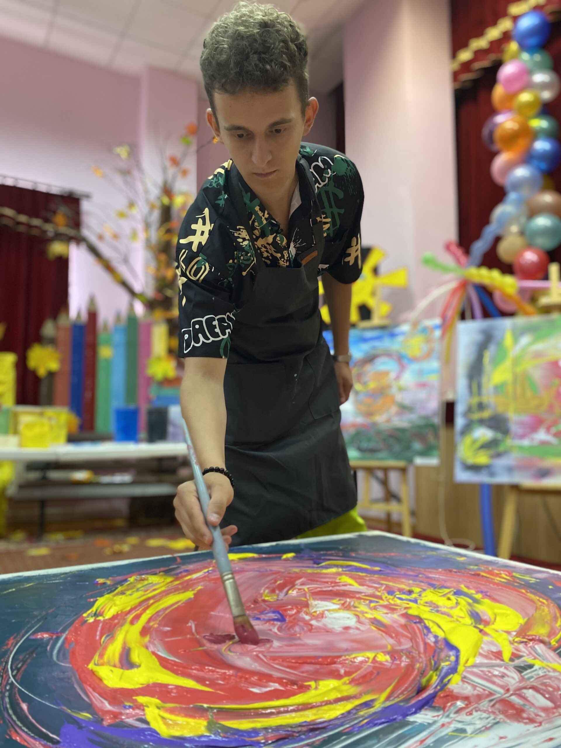 Вместе с художником Сергеем Дасом Дима создал картину, наполненную символами и светом. В центре холста — пылающее сердце: не то островок, не то целая планета, затерянная в необъятной Вселенной. Вокруг — глубокий космос, мерцающий безмолвием. А над сердцем парит летающая тарелка — словно маяк надежды, зовущий к теплу и взаимопониманию.