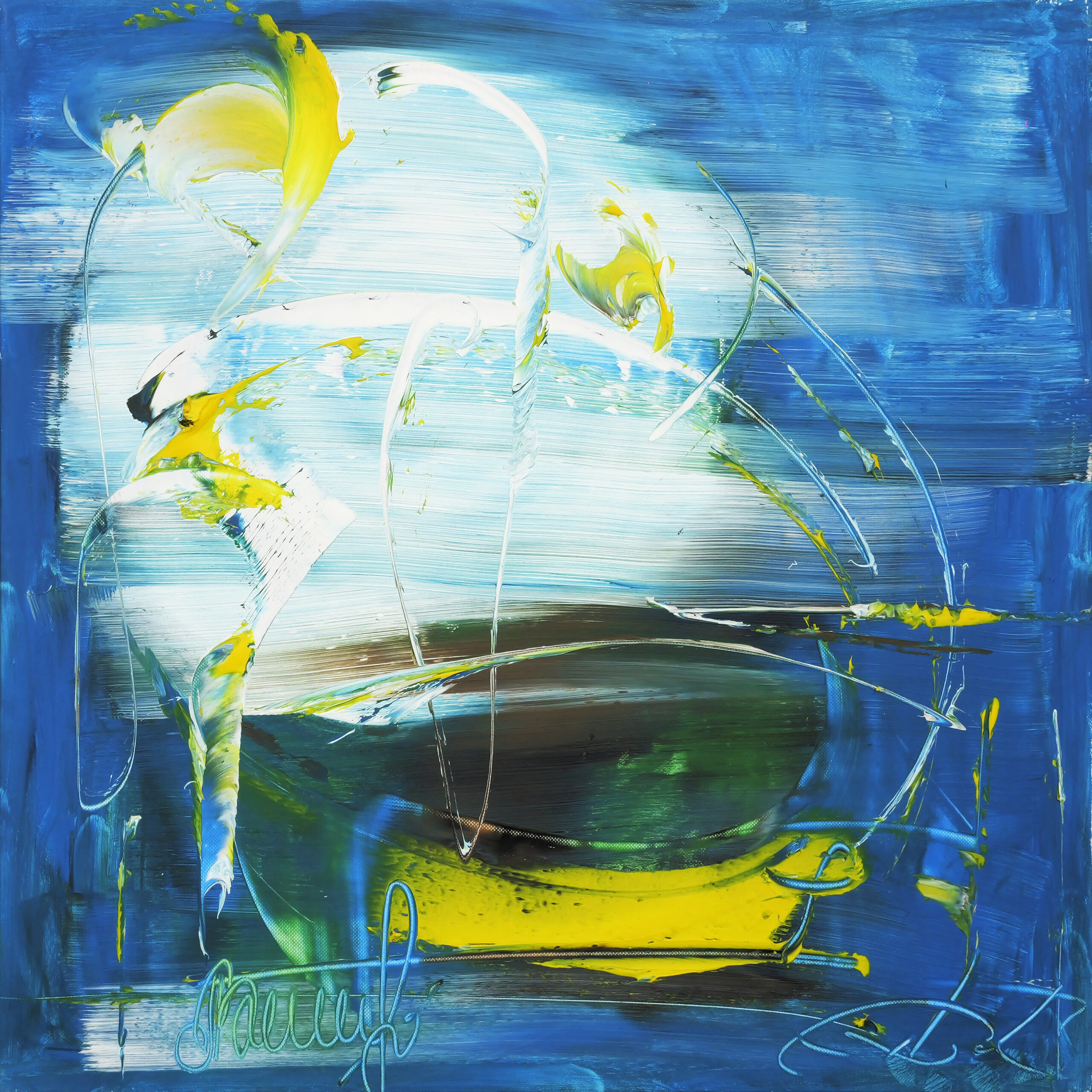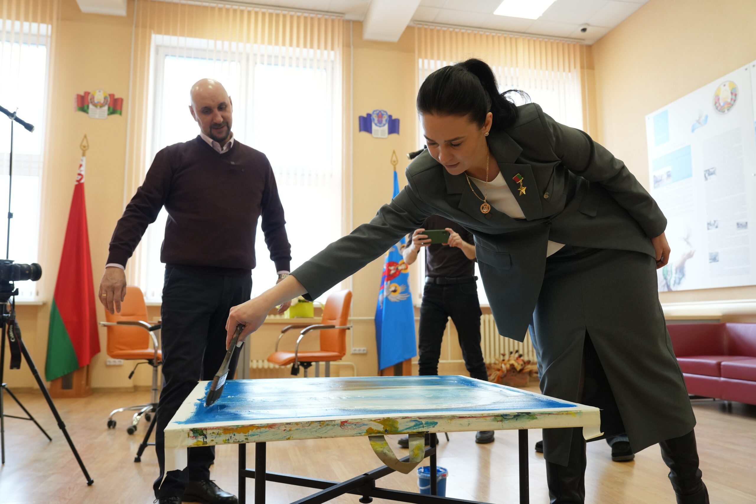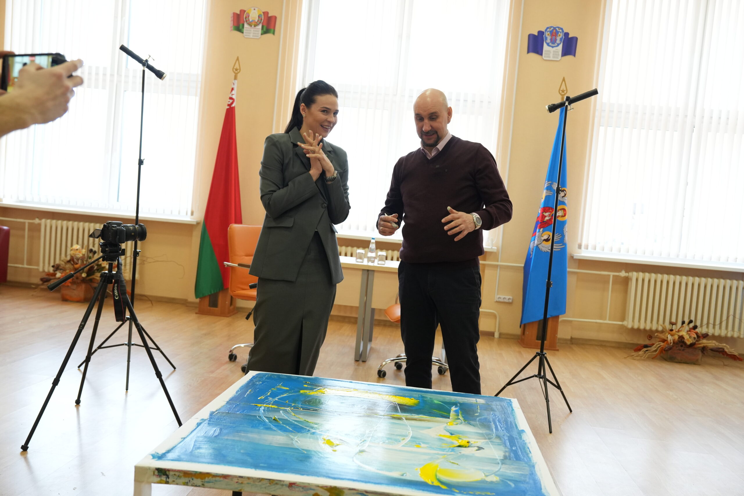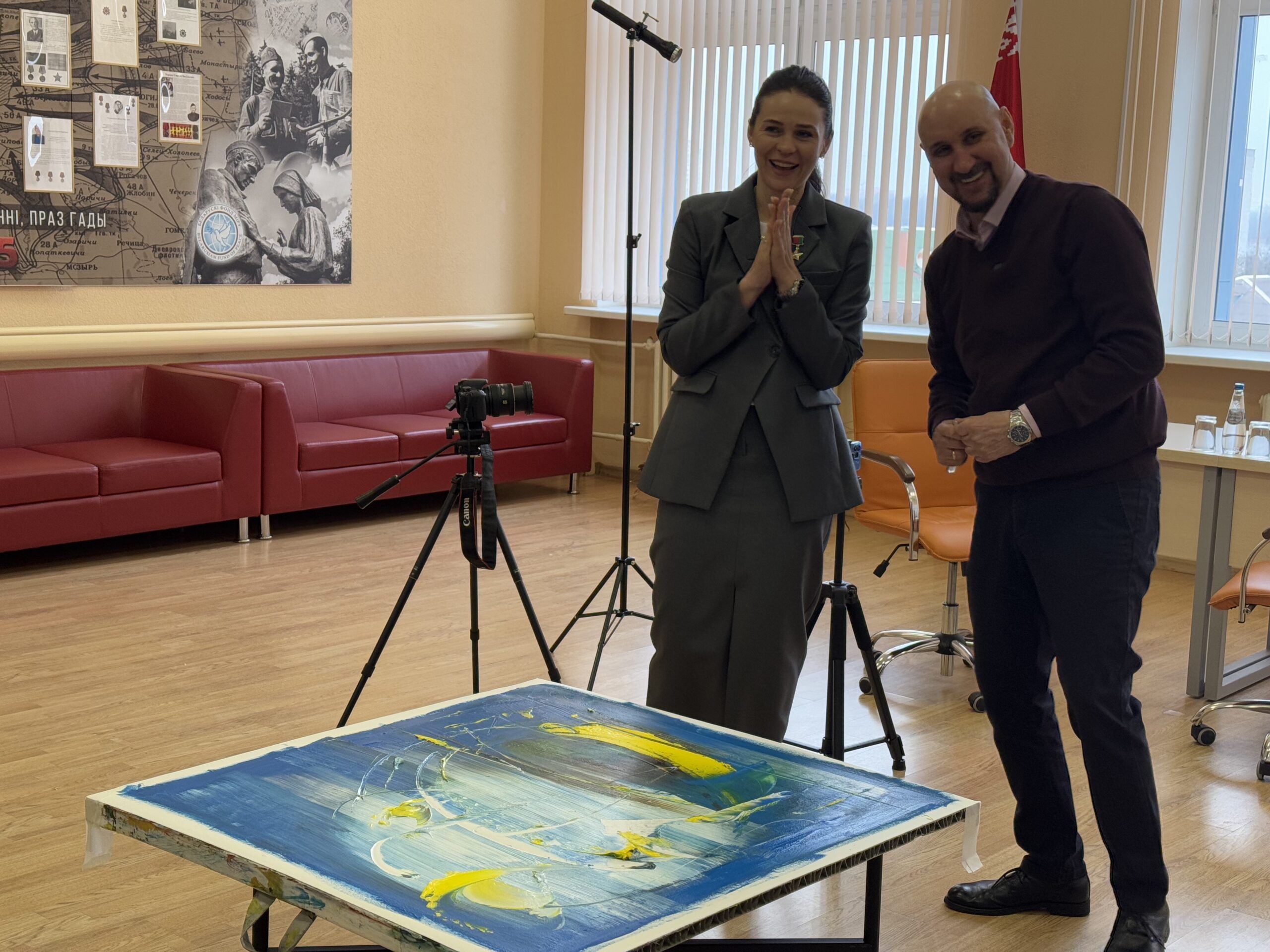 В соавторстве с художником Сергеем Дасом родилась картина — не просто изображение, а пульсирующее послание, её манифест. В центре — белый круг, чистый и сильный, как её внутренний компас ответственности. Под ним — прямоугольник, стартовая площадка, символ её устойчивости, её земли, откуда начинается полёт. Всё это – на фоне глубокого, бескрайнего синего космоса, словно дыхание того самого момента, когда она взмыла в небеса.